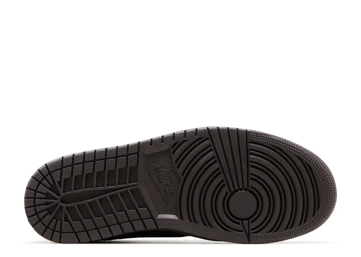 Travis Scott's signature reverse Swoosh stands out on the Air Jordan 1 Retro Low OG SP 'Velvet Brown', featuring a black tumbled leather upper with suede upper touches throughout. The brown nylon tongue gets a Nike Air tag, while mismatched Cactus Jack and Wings logos land on each back tab. A brown rubber cupsole gets stitched sidewalls and an encapsulated Air-sole heel unit for a plush sensation underfoot.